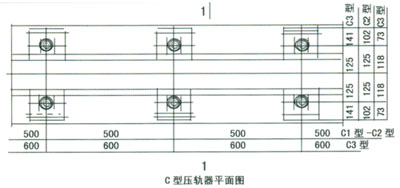 1、主要用于钢吊车梁带水平导向轮吊车轨道固定及大吨位软钩吊车轨道固定,根据吊车吨位大小及设计使用要求分为:C1、C2、C3三种压轨器。 2、C1型固定装置承受水平导向轮作用下的最大侧赂力为135KN,C2为220KN,C3为400KN。 3、固定件间距详见平面图。 4、其他参照A型焊接开型压轨器。