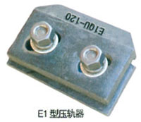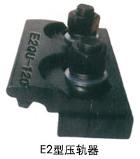 1、E型分为E1、E2型,此类固定装置可进行侧向调节,从而向轨道的铺设和调直提供好的条件。 2、固定装置窄而扁,可以提供有利安装尺寸,可用与带或不带导向轮的各式吊车。 3、通过楔形结构作用和互相啮合的压板上下两部分倾斜而自动锁定。 4、钢轨和吊车梁欢送的控制不成问题,底座的预加应力和轨道与底座之间的持久接触都得到保证。 5、螺栓为M20,8.8级高强度螺栓,拧紧力矩为:220N.M,E1可承受最大侧向力为140KN,E2可承受的取大侧向力为:120KN。 6、此类压轨器广泛应用于港口、码头、船厂、大型龙门吊轨道固定。
