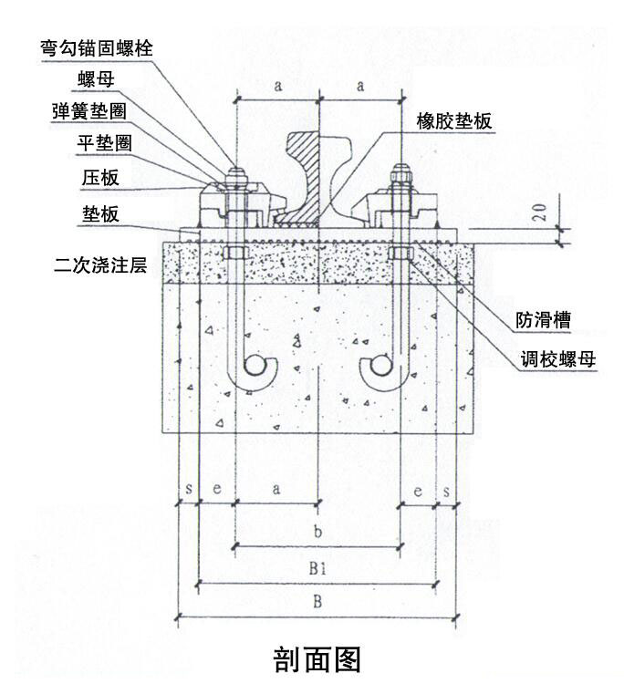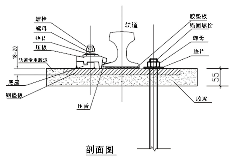 适用于地面整体道床、砼吊车梁、采用预埋螺栓固定。可调轨道